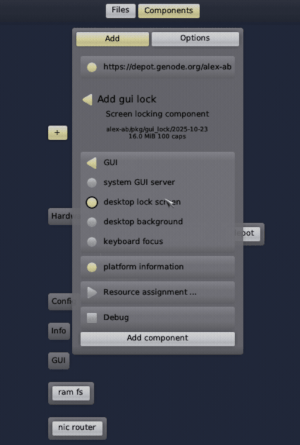 After downloading and installing, you need to configure it. As shown in the picture, the GUI routing have to go the "desktop lock screen". This is a special domain of the GUI multiplexer nitpicker in the Sculpt OS image, which will show the content of the component at one of the top most layers once activated.
