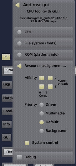 The MSR component is an component using the Pd::system_control interface, with which it monitors and reports changes of registers for temperature and frequency (AMD & Intel) and power consumption (Intel). Additionally, the component can be instructed by configuration changes to write some of the registers. Beside the quite low level MSR component, a Genode package with an additional graphical component is provided to make the interactive usage of the feature user friendly. All sources and package recipes are available via my github repository.