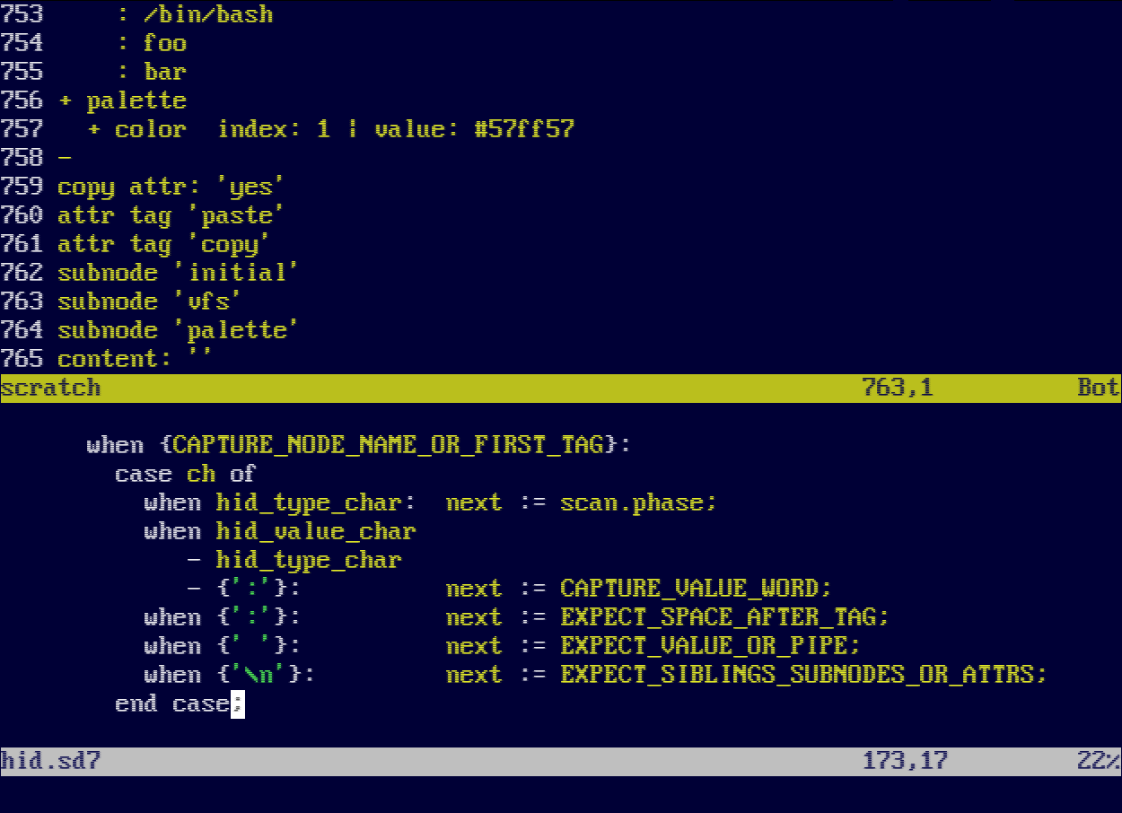 Vim as Seed7 IDE on Sculpt OS. The scratch window at the upper part of the screen presents the output of the program edited in the lower part. A press of F2 updates the scratch window instantly.