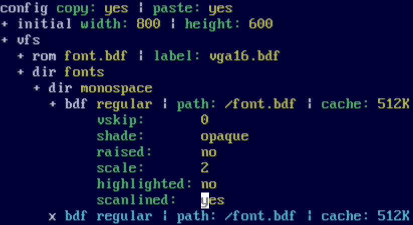 8x16 glyphs zoomed by 2x2 on a full-HD laptop display nicely resemble a text mode of 120 by 33 characters. The glyph rendering, like the scanline effect, can be tweaked interactively.