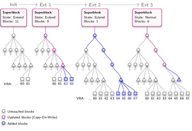 After the initialization step, the CBE keeps doing extension steps on the targeted tree until the contingent of new physical blocks is depleted. At the end of each of these atomic extension operations, the CBE updates the superblock, secures the device state, and tries to prepone up to 8 concurrent requests before starting the next extension step.