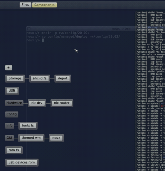 To follow the guide described in this article you need to have a Sculpt installation at hand with at least 2 GiB of free space to spare on the used file system. We want to be able to inspect the log output of the CBE tools. For this reason you should enable the log display in the upper-right corner of the Leitzentrale of your Sculpt. Furthermore, we will need to have an internet connection. You can establish the connection using the Network controls in the upper-right corner of the Leitzentrale. In order to be able to deploy the required packages, the package sources genodelabs and cnuke must be enabled in + → Depot → Selection.